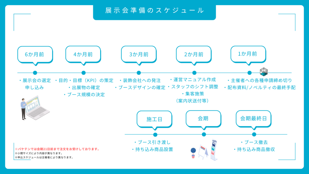 理想を言えば、会期の6ヶ月前には動き出したいところです。まずは「どの展示会に出るか」という選定から始まりますが、この時期に事務局へアプローチし、出展資料を取り寄せておくとゆとりがあります。