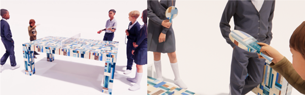 余材でできたパネルを並べて「パズルのような卓球台」をつくり、その上でラリーを続ける実験。打ち合うたびに「つながる」感覚を持たせ、卓球の余材自体に価値を持ってもらう検証。