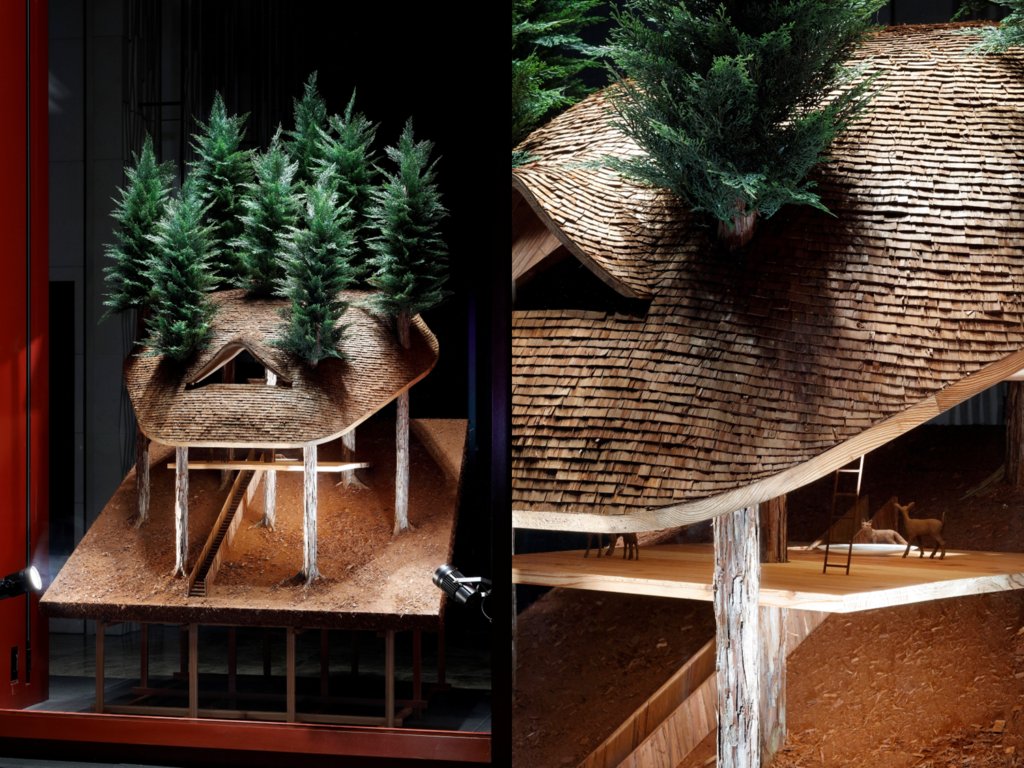 Personal forestとはリサーチの中でみつけた“人が1日に必要な酸素量=約8本の木が作る酸素量”という文脈から独自に考案した、人と森の関係性の単位です。人と自然が共存する架空のサステナブルな空間を、清水寺や出雲大社の屋根を手がける檜皮葺職人「友井社寺」さんとの共創で作り上げました。