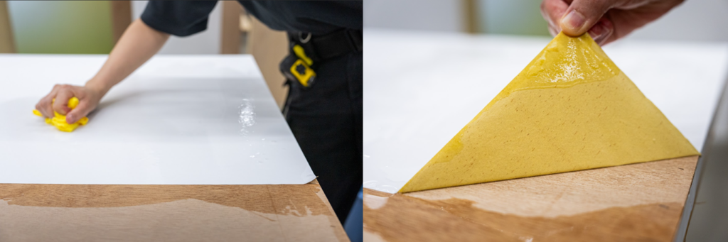 そこで、壁面や什器などの木工造作物において、LOOPGLUEを使用して表具仕上げを行うと、水をかけるだけで表具をきれいに剥がすことが可能になります。壁紙の剥がし残りが発生せず、木工パネルを傷めることなく再利用できるため、リユース時にも新品同様の状態で使用することができます。この特性により、壁面パネルを制作する際の木材の資材調達費および制作にかかる人件費を、それぞれ約15%削減できると見込んでいます。