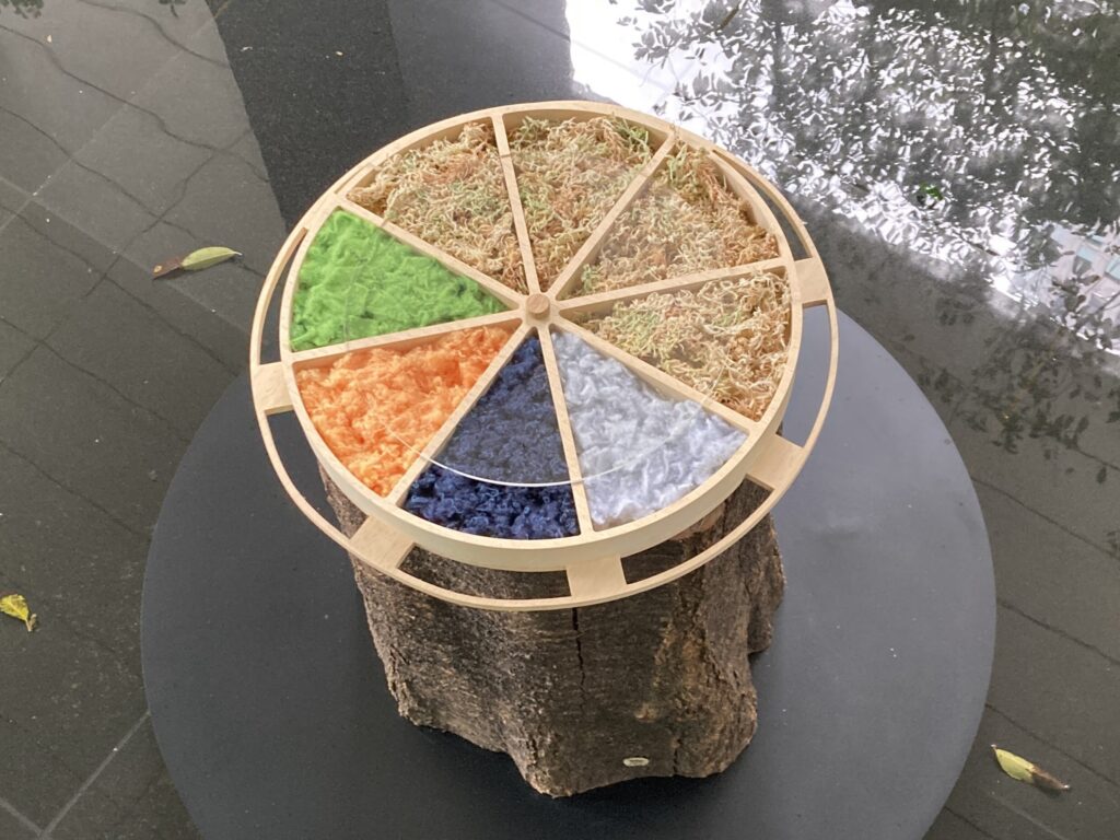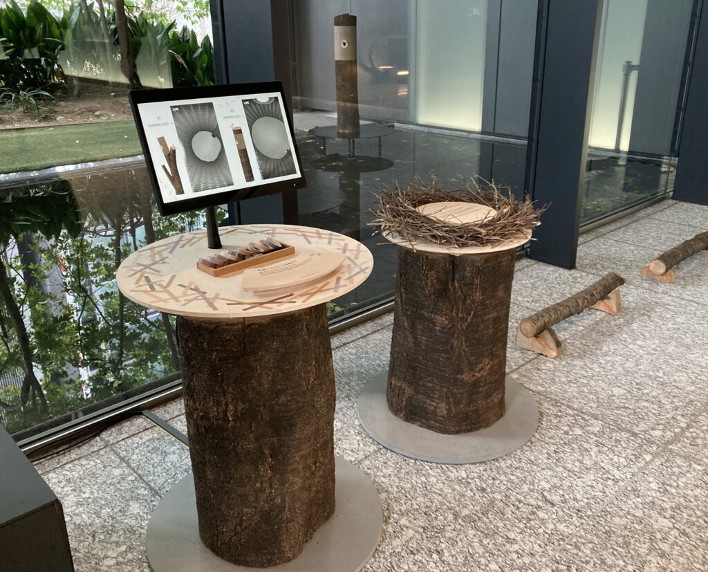鳥たちは小枝や葉だけでなく、人間の生活空間に存在する多様な素材を生かして巣を作ります。本プロジェクトでは、東京スクエアガーデンのイベントで役目を終えた端材や建物から出る廃材などの生分解性素材を集めた巣材提供スタンドを設置し、自然由来・都市由来の素材を鳥たちに選択してもらう仕組みを導入しています。これにより、人間にとっては不要になったものが野鳥たちにとって大切な「家」の一部になるという、都市の中で豊かな生態系が育まれるプロセスを支え、鳥たちの生態をより深く理解できる場を生み出しています。