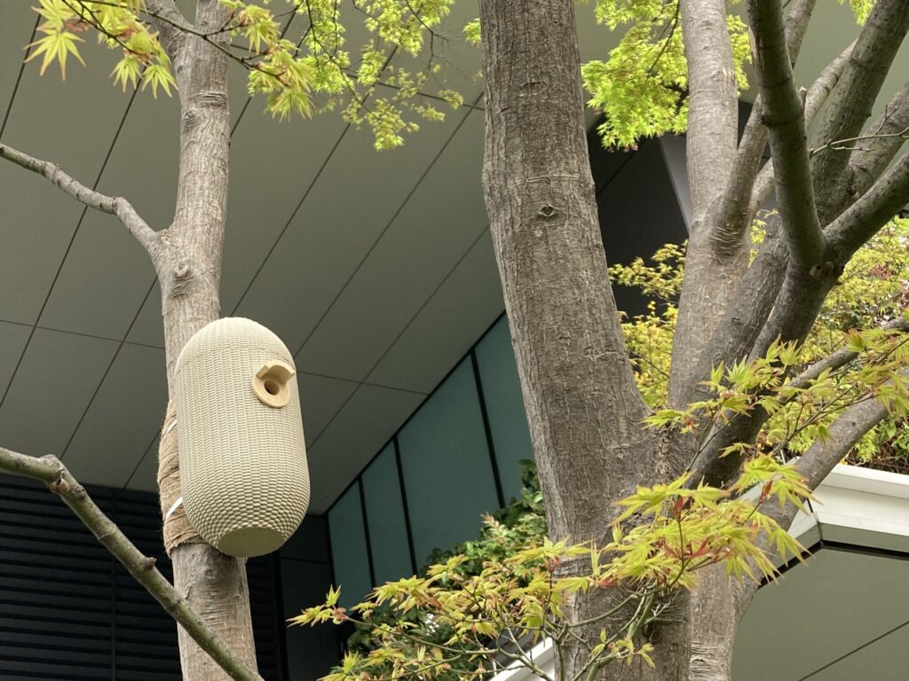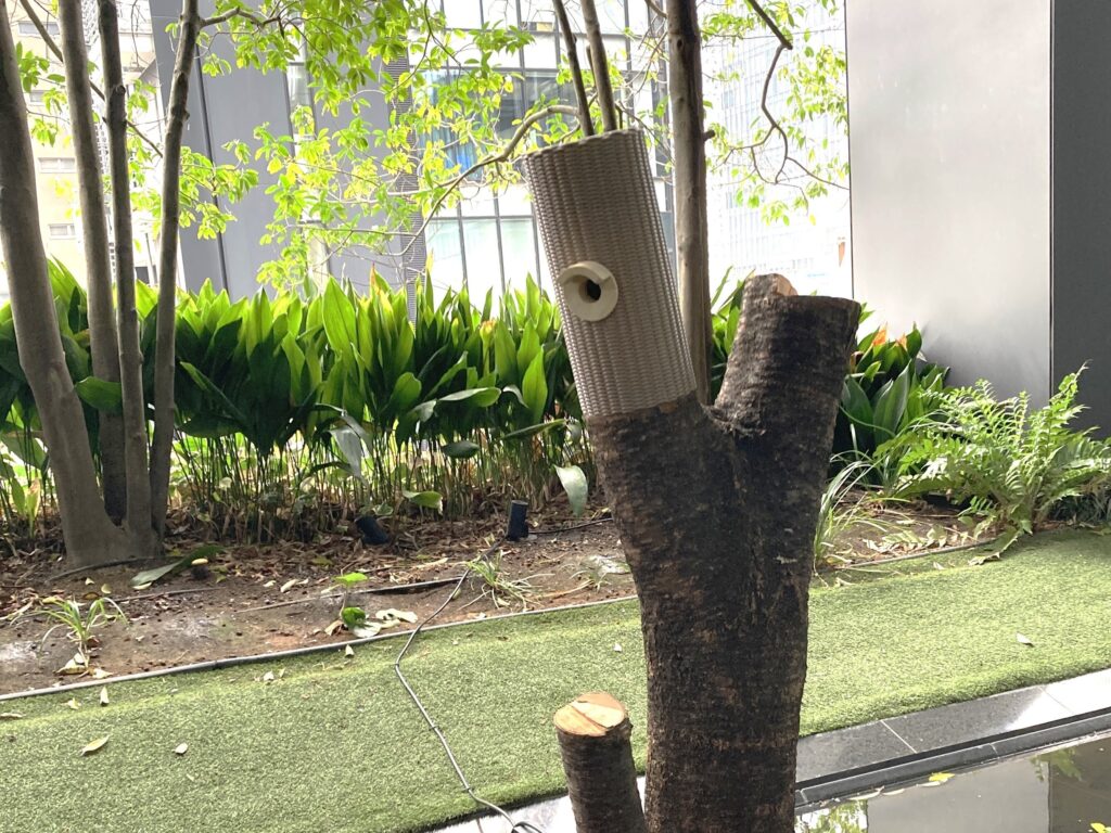 大手町タワーの敷地の約3分の1に広がる緑地「大手町の森」から切り出された剪定丸太を生かし、まるで木そのものが自然に成長して形作られたかのような巣箱です。周囲の木々と完全に一体化して風景に溶け込むことで、外敵の目から小鳥たちを安全に守るカモフラージュの役割も果たしています。