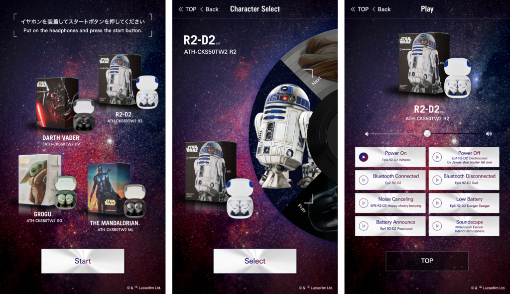 永山(オーディオテクニカ 商品企画担当):完全ワイヤレスイヤホンでは、起動音や、イヤホンの機能に付随した確認音の全てに、ルーカスフィルム公認の、劇中に使用した音声データをそのまま搭載しています。映画の感動をそのまま詰め込んだ製品にするため、ルーカスフィルムの膨大なデータベースの中から、キャラクターごとに異なった音声を時間をかけて選んでいます。多分マニアの方ならどのエピソードのどの場面の音なのかがわかると思うので、来場者の方々に音声ガイダンスを楽しんでいただけるコンテンツも博展さんにリクエストしました。