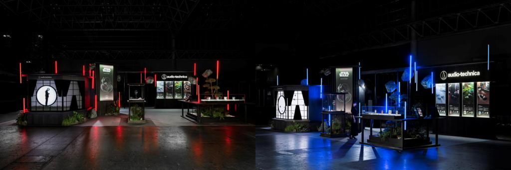2025年4月18日〜20日の3日間、幕張メッセにて開催された「スター・ウォーズ セレブレーション ジャパン2025」にて、博展は日本の音響機器メーカー・オーディオテクニカと『スター・ウォーズ』をモチーフにした製品を販売する展示ブースのデザインを担当しました。黒澤明などの日本映画や日本文化の影響を受けたシリーズとして知られている『スター・ウォーズ』の世界観を表現する上で、博展チームは「日本庭園」をモチーフとする展示ブースを提案。前編に続く本記事では、「茶室」をモチーフとする空間演出と、博展内で一気通貫して制作したデジタルコンテンツの制作プロセスについて振り返ります。 |