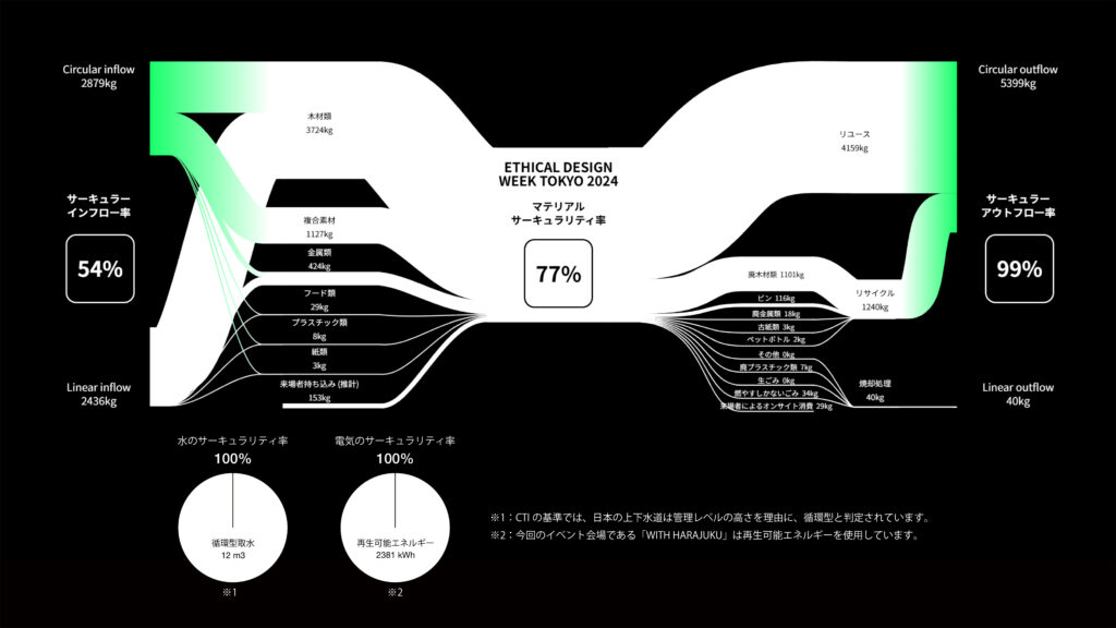 社内システムに重量計算と入力フォーマットがあり、アップロードすると自動生成される仕組みです。例えば、サーキュラーデザインをフル実装したイベント「ETHICAL DESIGN WEEK TOKYO 2024」ではアウトフロー率が99%という高い数値が出ました。一方で、インフローでは木材のFSCなど認証材調達がまだ難しく、リニアなインフローが重量として増えるため、54%と低めに出る課題が見えました。これにより、次は木材調達を強化する、といった中長期のアクションが設定できます。