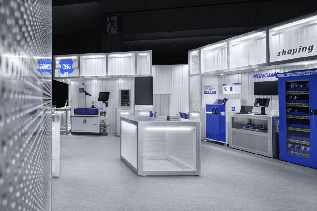 鈴木 当社クライアントであるOSG社が「JIMTOF(日本国際工作機械見本市)」に出展したときのブースでは、「リユース部材の活用」をテーマに、マキシマを全面的に使っています。そこにパンチングメタルやガルバリウム鋼板といった素材を組み合わせ、システム部材を使いながらも高級感のある空間に仕上げました。回収時、システム部材はリユース、金属は社内の「リユースハブ」という仕組みにストックし、他案件へ提供できるようにしています。