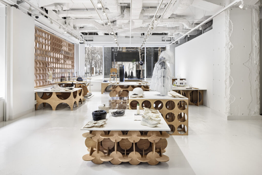 制作のプロセスでは、資源循環を前提にした工法開発も重要です。従来は接着剤で固定する方法が主流でしたが、どれだけ循環可能な素材でも接着してしまうと将来的に廃棄物になりやすい。接着剤を使わずに空間や什器を作ることを意識しています。