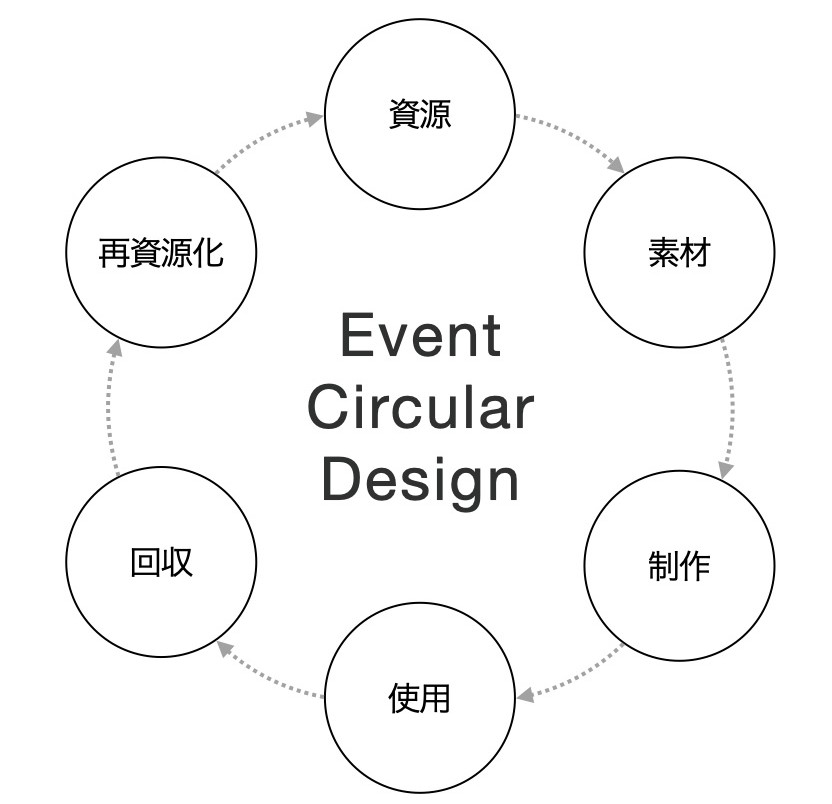 イベントのプロセスを「資源 → 素材 → 制作 → 使用(会期)→ 回収 → 再資源化」という6つに分解して見ていく。従来は「どんな素材からどんな空間を作り、主催者や来場者にどう使ってもらうか」という3つのプロセス(素材 → 制作 → 使用)で完結していたデザインに対して、その前後を俯瞰しなければ循環は作れない、という説明のために活用しています。