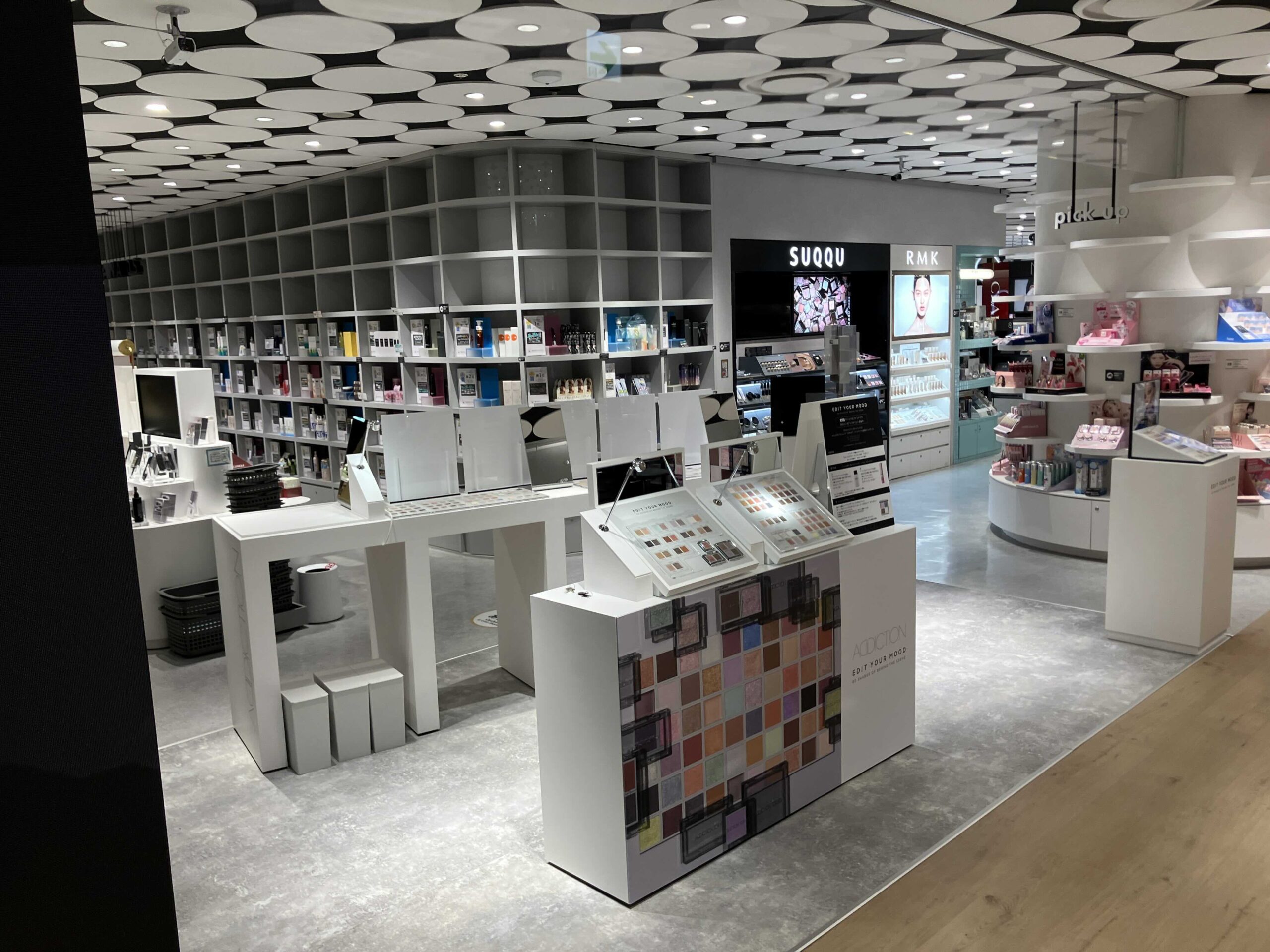 クライアントで保管されていた什器をただ再利用するのではなく、全60色の新作アイシャドウが最も魅力的に見えるよう、動線とレイアウトを設計しました。コストを最適化しながらも、ADDICTIONの洗練された意匠性を空間に反映させました。