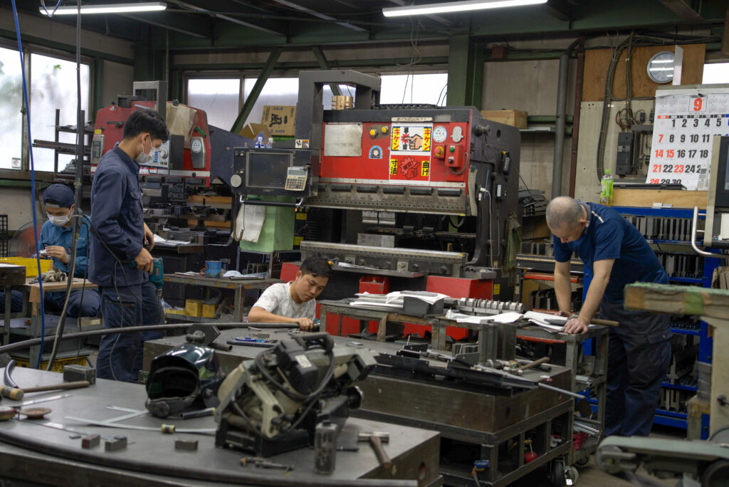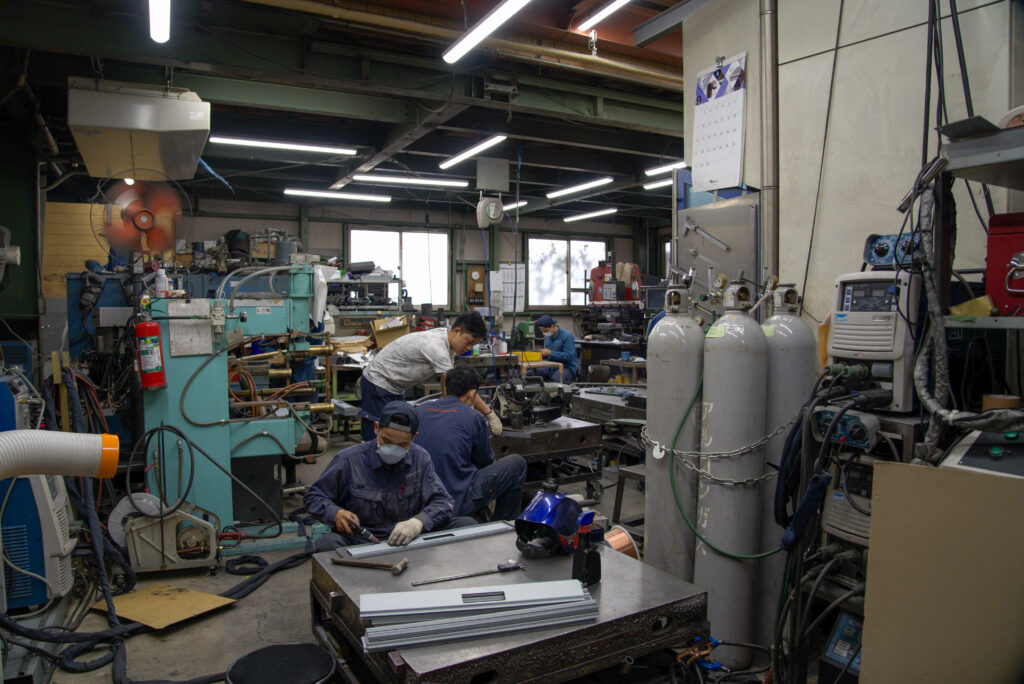 0.1ミリ単位の誤差が許されない加工作業に集中する従業員のみなさん。この工場から、ハイレベルな技術を用いた造形物が生み出されている。