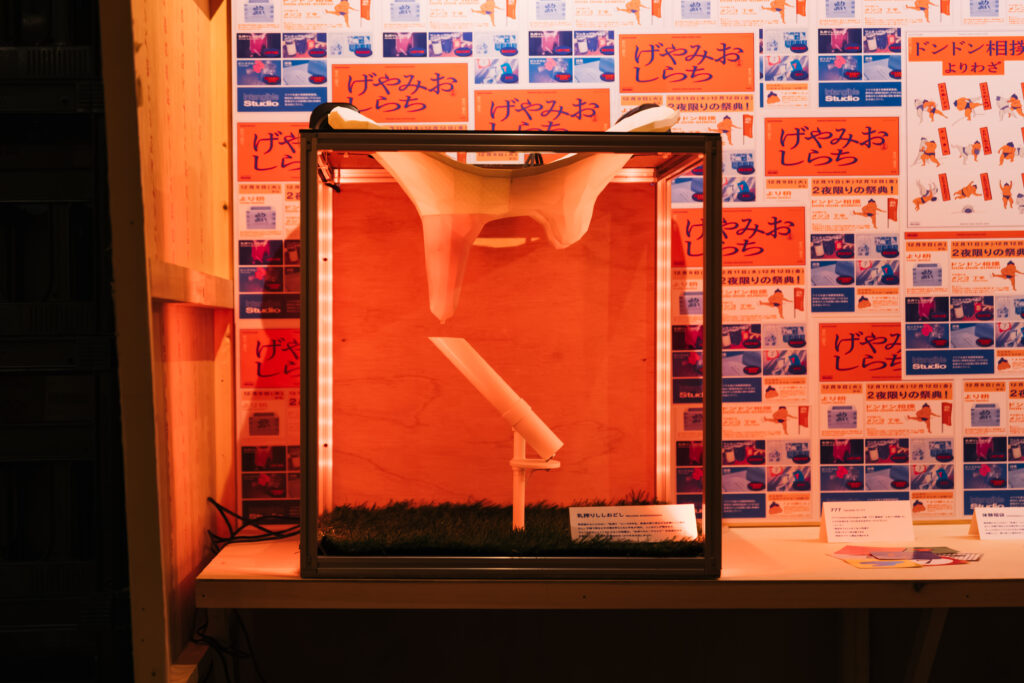 木下: 「乳搾りししおどし」という企画があります。これは僕が飲んだ帰りに、歩いているときにふと頭に浮かんだ言葉なんです(笑)。「ししおどしって面白くないですか」という言葉の響きから、「これをグラフィックにしたらどうなるか?」「空間に落とし込んだらどんな体験になるか?」と、いろんな方向へのアウトプットを広げていきました。