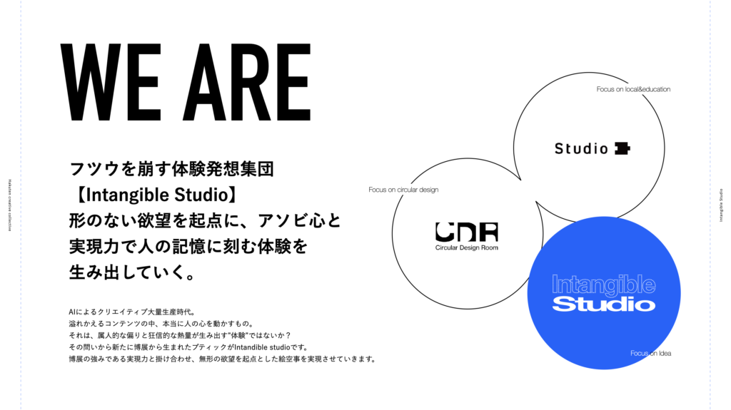 僕らは空間施工ではなく体験発想を目的としたチーム。博展はしばしば「tangible(有形)」と称されることが多いので、それとは逆の「intangible(無形)」をつけ、新しい体験を作っていく集団にしていこうと「Intangible Studio」と名付けました。