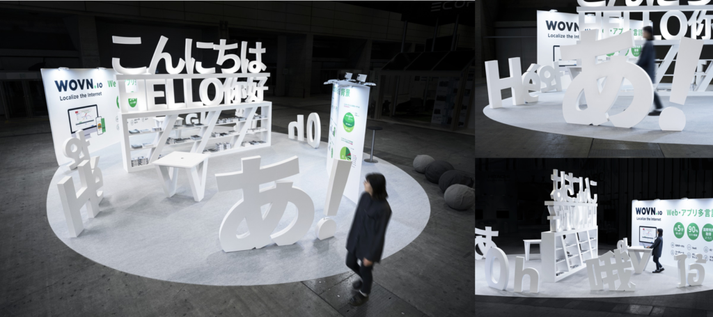 ブースデザインでは、「あ!」という言葉を多言語の立体文字で表現し、空間全体に散りばめました。これは、WOVNが多言語に関わるサービスであることを示すだけでなく、多言語化によって世界を繋ぎ、豊かにするという企業の未来像を来場者が体感できる空間を意図したものです。