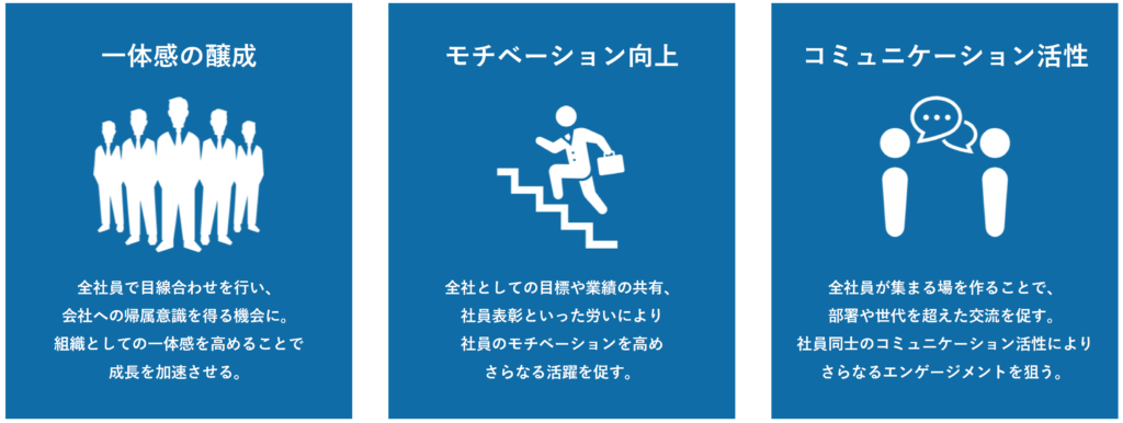 ビジョンや目標を共有し、全社で同じ方向を向くための社内イベントですが、単発開催だけでは、理解することはできても共感して実践に移すところまで到達しません。継続的な発信の場を設けることで、社員の実務レベルまで落とし込むことが重要です。
