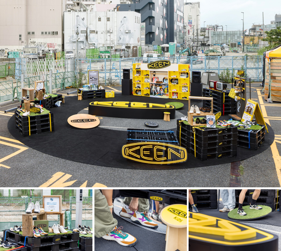 Z世代をターゲットに、イベントのキーワードである「ノスタルジー」、「レトロ」を掛け合わせ‟レコード”をコンセプトに開催。開場装飾は、パレットをラッシングで巻いて什器にしたり、KEEN様の倉庫にあった備品を会場で流用したりと、環境に配慮したイベントとなっています。