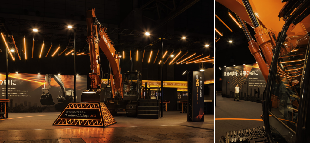 単管の重なりと光のラインが螺旋状に広がる有機的な造作で、どんなお客様にも柔軟に向き合う日立建機の姿勢を表現。そのラインの中から2台の建機が飛び出すような印象的なデザインで、未来への躍進を伝えています。また、構造材にはトラスや単管、木素地、エキスパンドメタルなどを活用し、現場視点のアプローチを取り入れつつ、リサイクル・リユース可能な部材を使用することでサステナビリティにも配慮した空間設計となっています。