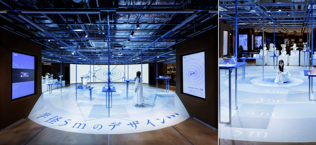 会場全体をコーポレートカラーである鮮やかな「青」で統一し、ブランドの世界観を強く印象づけました。床面には1mごとのガイドラインを引き、その「半径5m」の範囲内にプロダクトをランダムに点在させるという、コンセプトを視覚的に体験できる展示手法を採用しました。