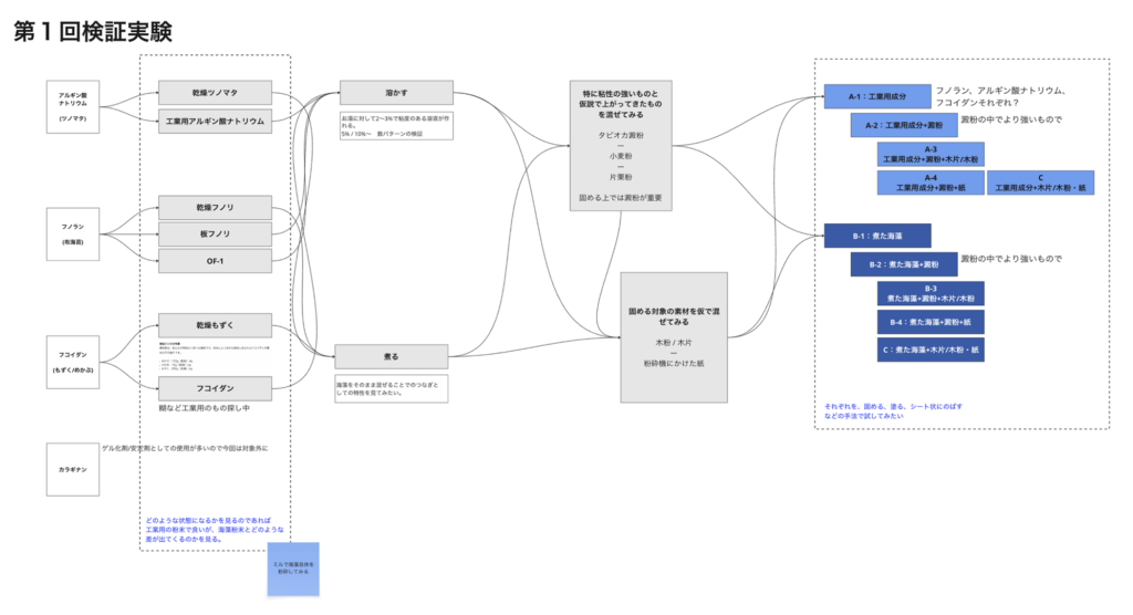 普段の業務の隙間時間に検証しながら進めていたので、1ヶ月ほど検証期間を設けた後に、結果を共有するプロセスを何度も繰り返していきました。アルギン酸ナトリウムを接着剤として使えるのではないかというアイデアに辿り着いたのは、2023年10月にリサーチをスタートしてから半年ほどが経ってからでしたね。
