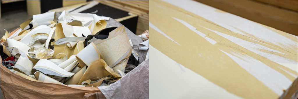 これまで分解可能性や資源循環性をテーマに、サーキュラーデザインルームとして仮設空間のデザインにおけるさまざまな工法を模索する中で、接着剤を使わずに乾式で素材をつなげる方法を採用してきました。接着剤で貼り付けた素材の多くはイベント終了後にリサイクルできず、廃棄の対象になってしまうため、「接着」のあり方についてはこれまでも課題に感じていたんです。