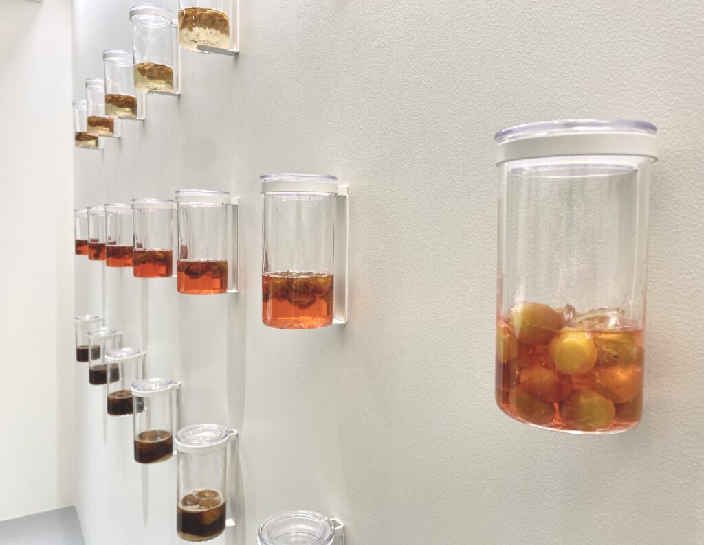 3種類の梅シロップが1週間で変化していく様子が壁面に展示されています。