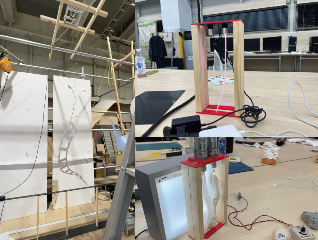 テーマが決まった段階で、私はウィンドウにハグされるような、包み込まれるような表現を動きによって生み出すにはどうするべきか、というところをモックアップなどで検証を進めていきました。初めは2つの構造物がそれぞれ近づいたり離れたりすることで関係性を構築できないかを検証してみたり、異素材同士をぎゅっと押し付けてみたり、照明との連動や様々な素材を纏わせることで柔らかさを作り出したり、機構でハグの動きを再現できないかを試したりしていました。