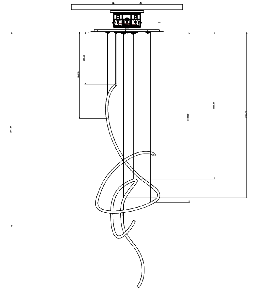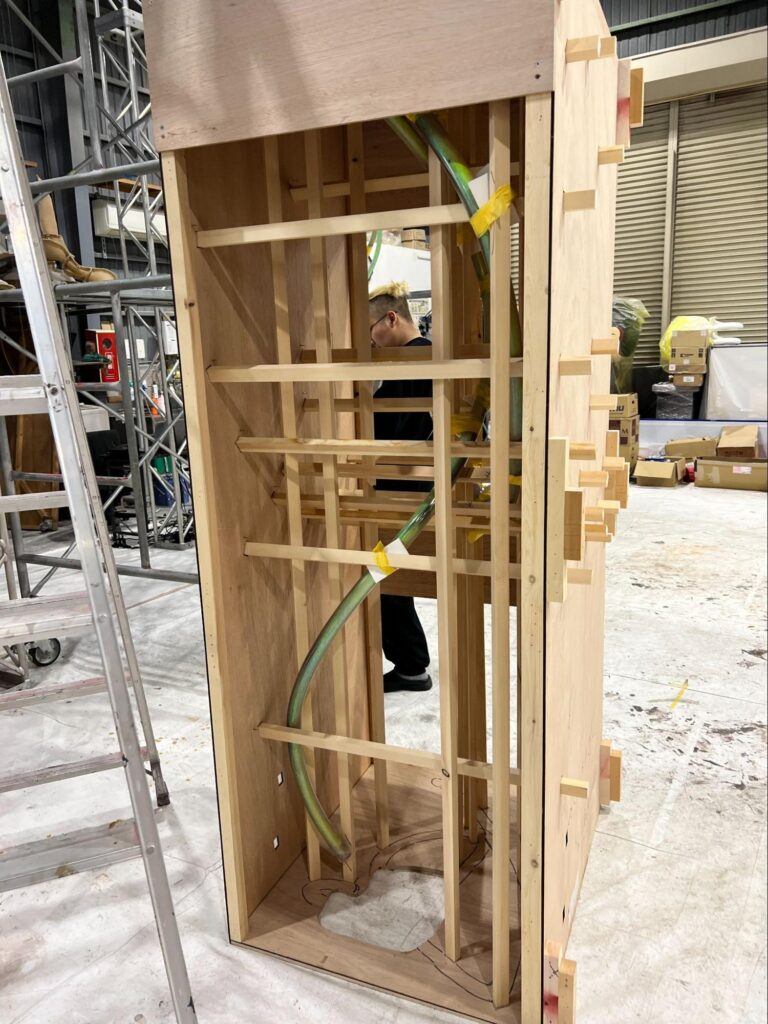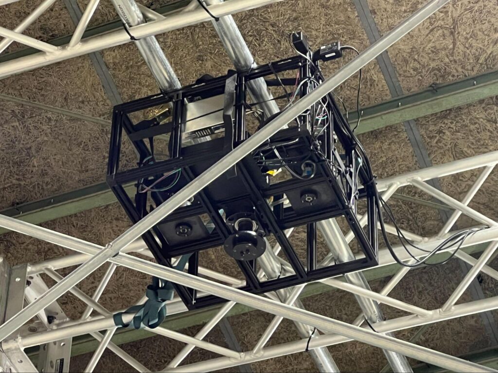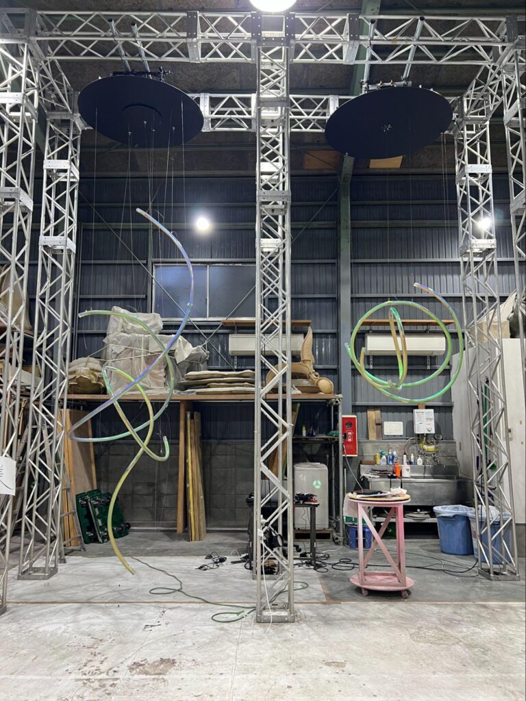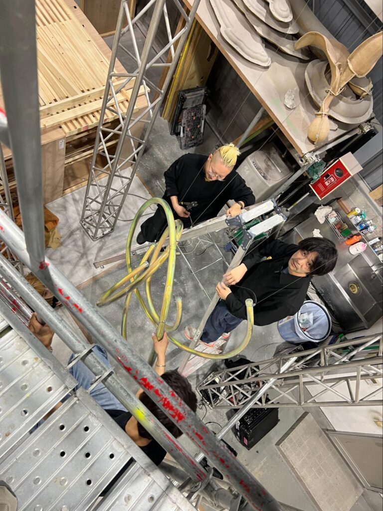 また、HPCのライン造形物は株式会社ラッキーワイド様に製作いただき、ラッキーワイド様の倉庫で吊り込み位置や動作の細かい検証を繰り返し行いました。ぶつからず、美しく動かすために、吊り位置の微調整やワイヤーの長さ変更などのトライアンドエラーを重ねています。