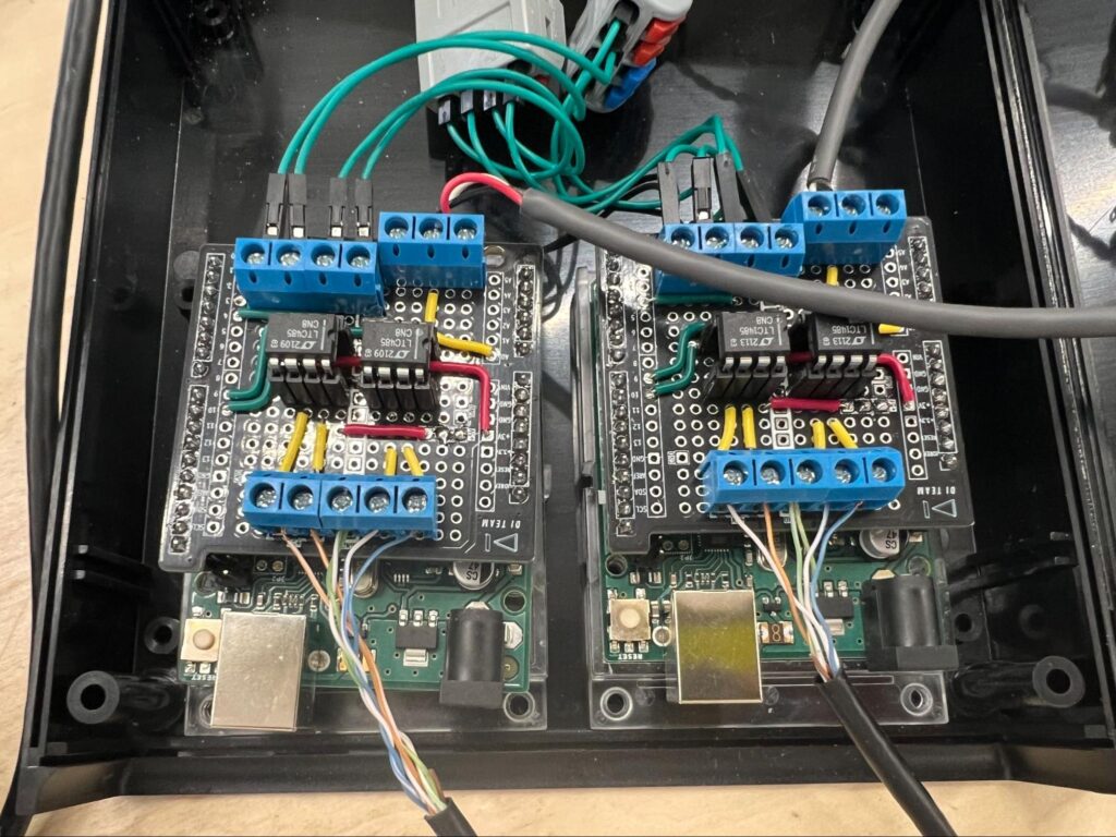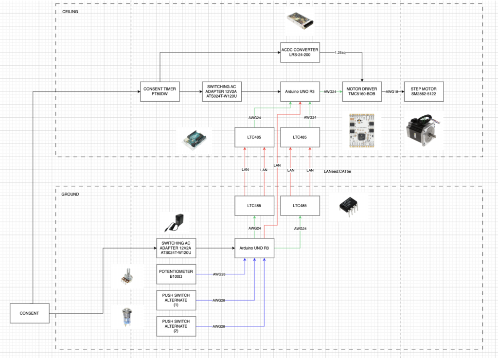 今回、インタラクティブに操作する必要がないため、機構は天井側で完結していて電力も天井にあるものの、撮影時などには任意の動きに調整する必要がありました。そのため制御系の機材は床側、天井側にモータードライバを設置しました。天高が5M弱だったので諸々信号ケーブルが迂回することを考えると6.5M程度になると予測し、通信にはRS485のモジュールを使用して安定性を確保しています。モータードライバはTMC5160を使用。