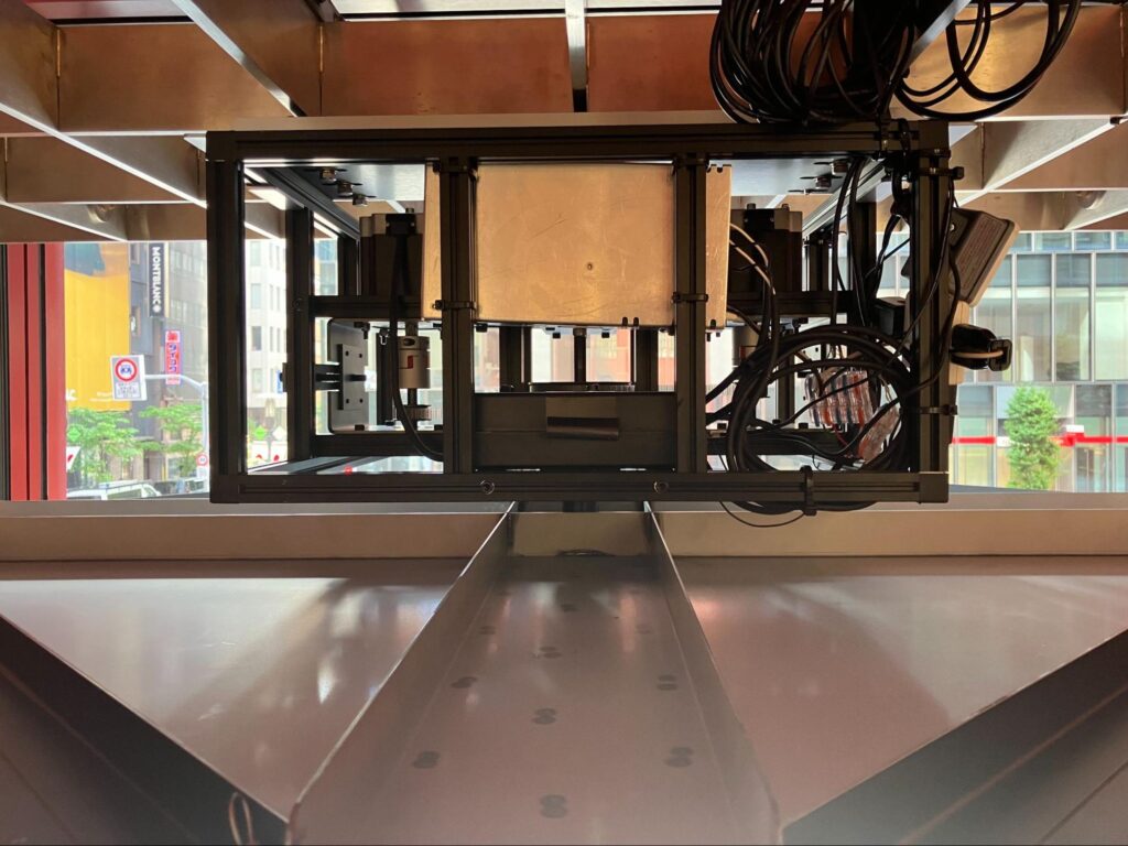 このショーウィンドウは店内のオープンスペースに存在していて、道路側だけでなく店内からも全容を見ることが出来ます。つまり、機材を隠すスペースや展示の安全性などにおいて気をつけるべき点が多くあります。今回は特に作品の生命感を表現する上で、作品以外のノイズとなる造作要素をなるべく排除しつつ安定した動作を生み出すために工夫が必要でした。