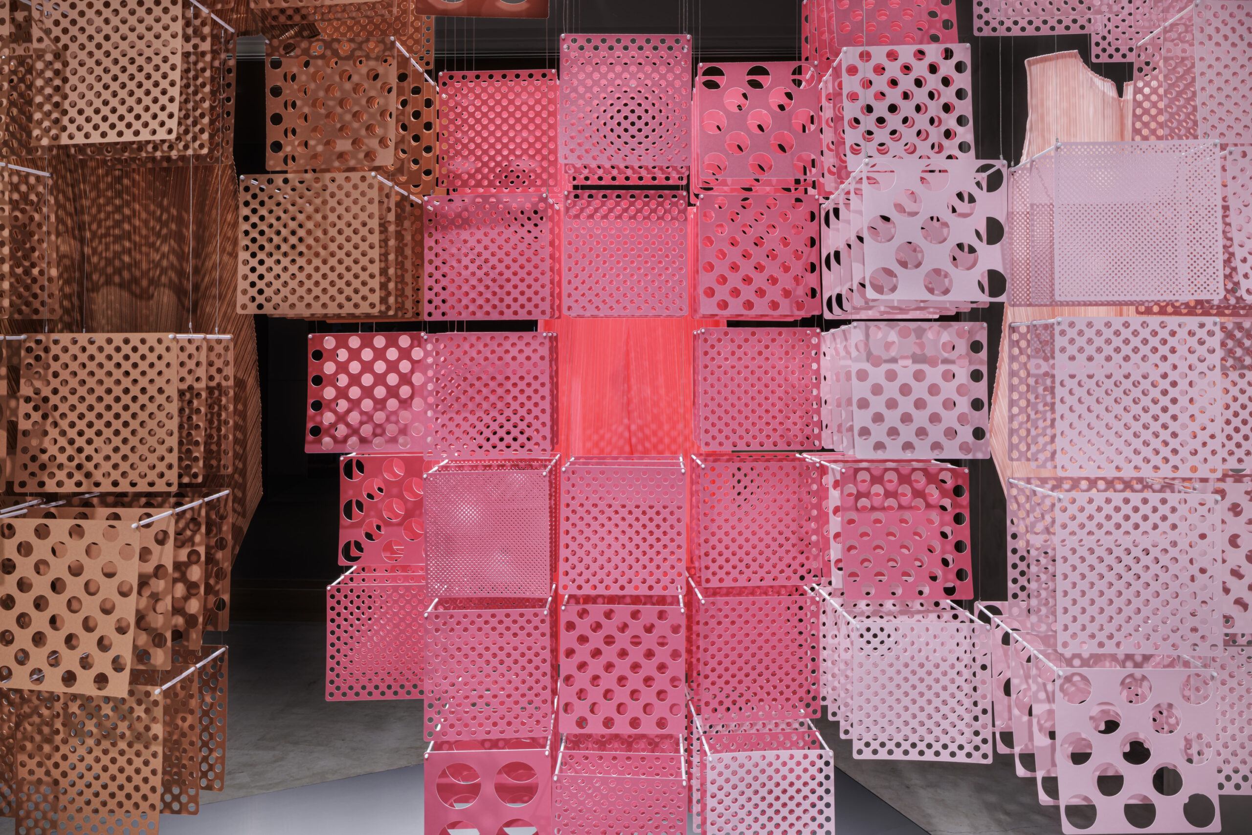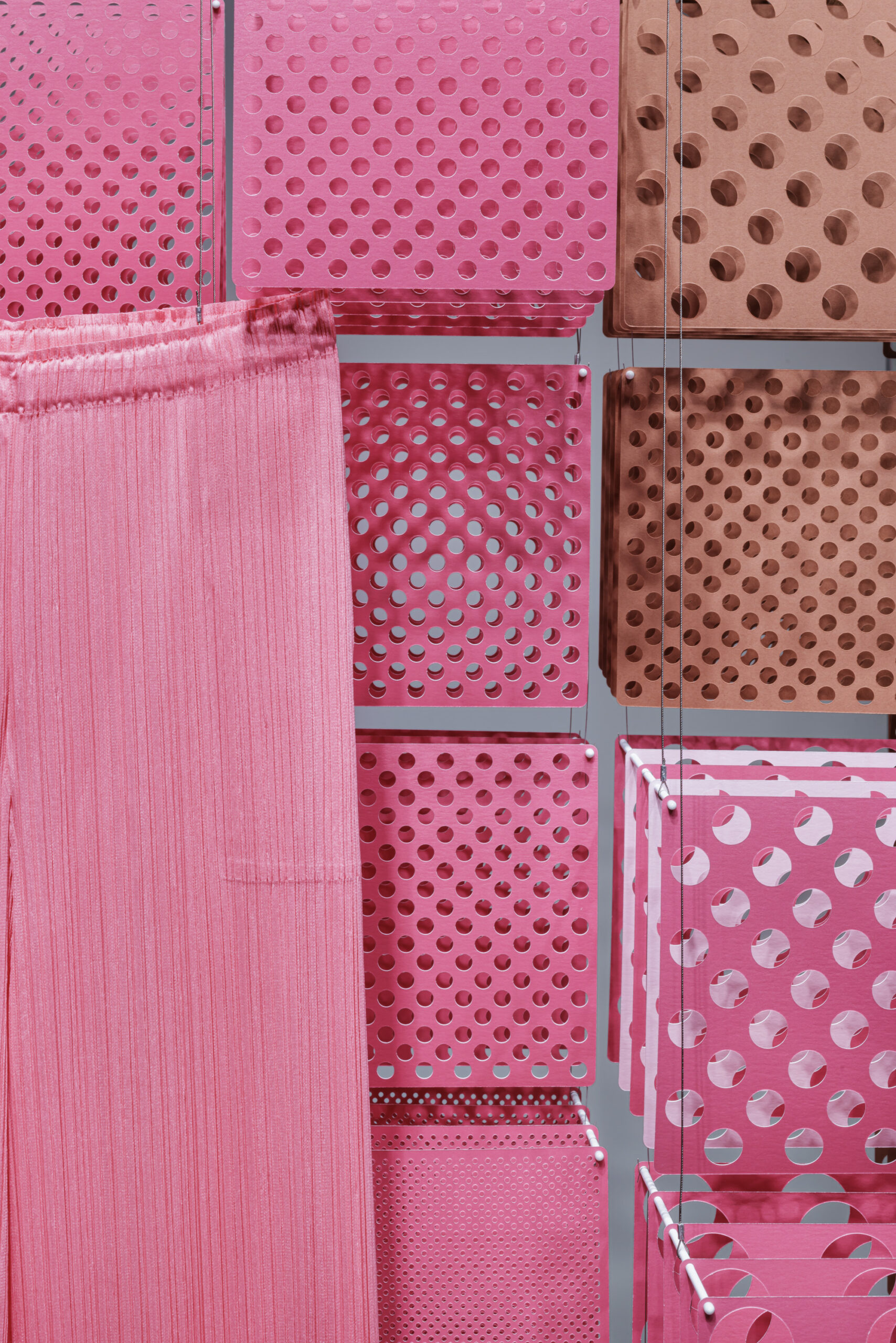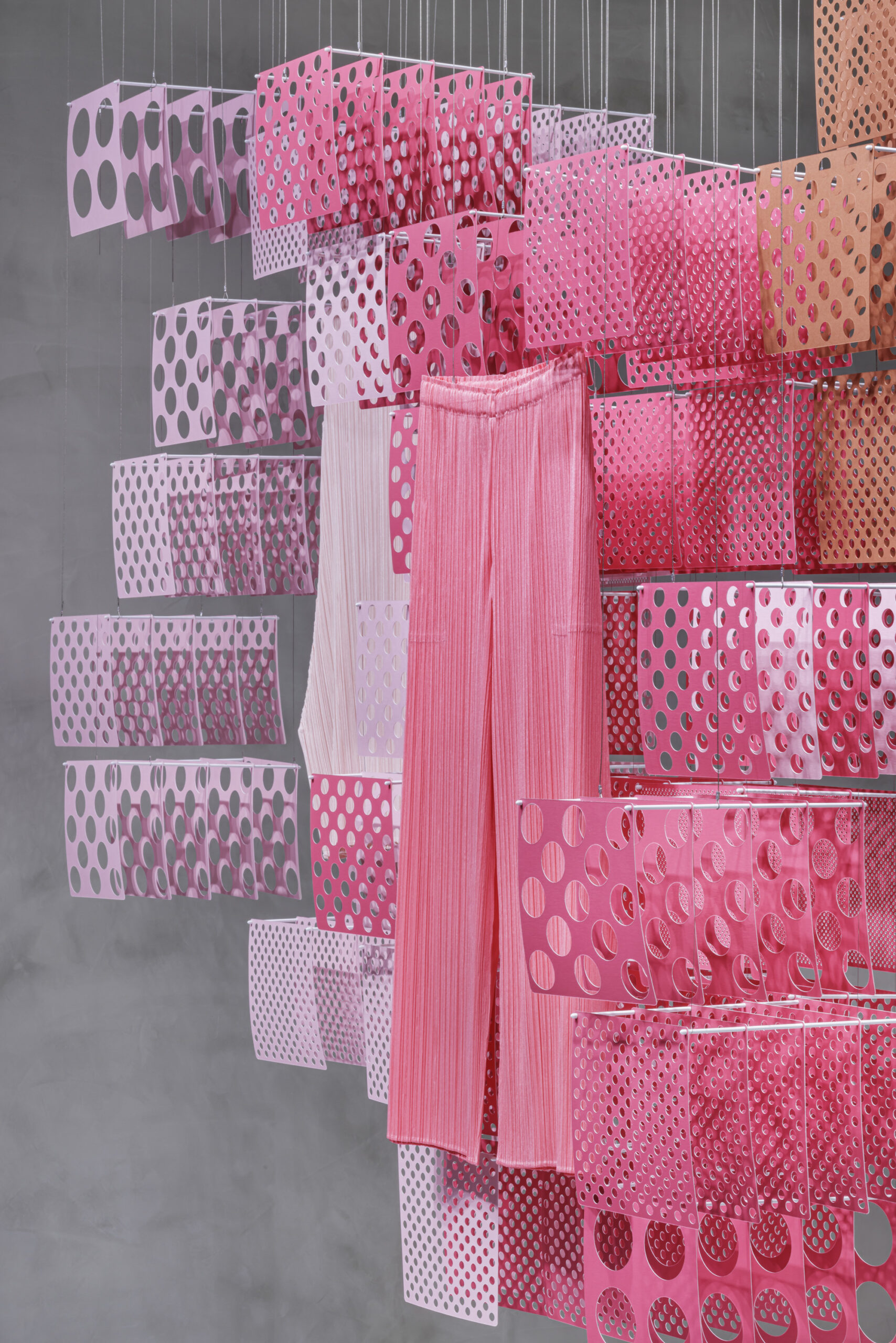 PLEATS PLEASE ISSEY MIYAKEの2026年春夏シーズンのテーマはSERENDIPITY。 この考え方を空間へと翻訳するため、服のシルエットをピクセルの集合体として分解し、固定された輪郭から解き放つインスタレーションを構成。 SERENDIPITYというテーマのもと、偶然の出会いや視点の変化によって生まれる発見を、軽やかな紙の層によって空間化したディスプレイです。 |