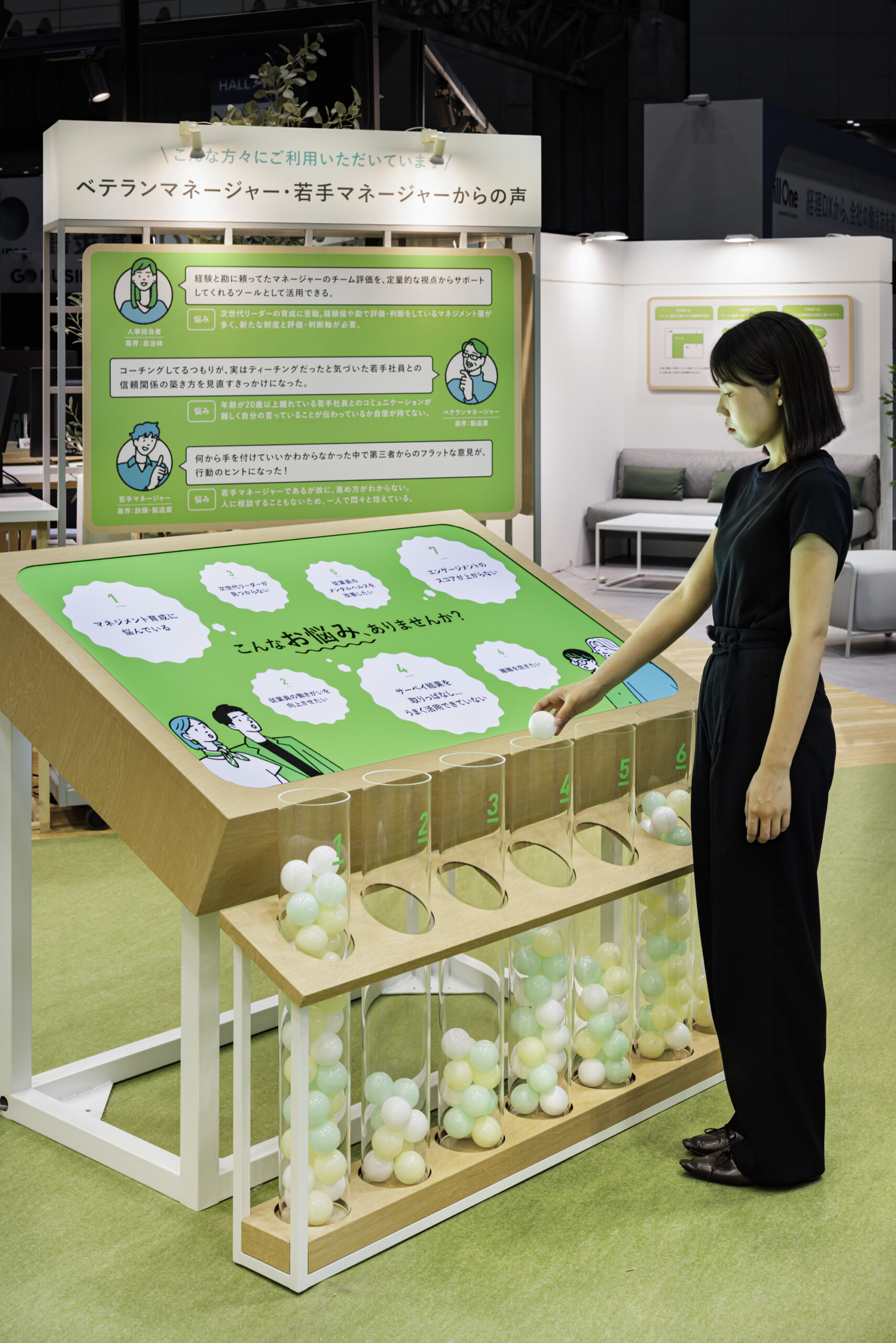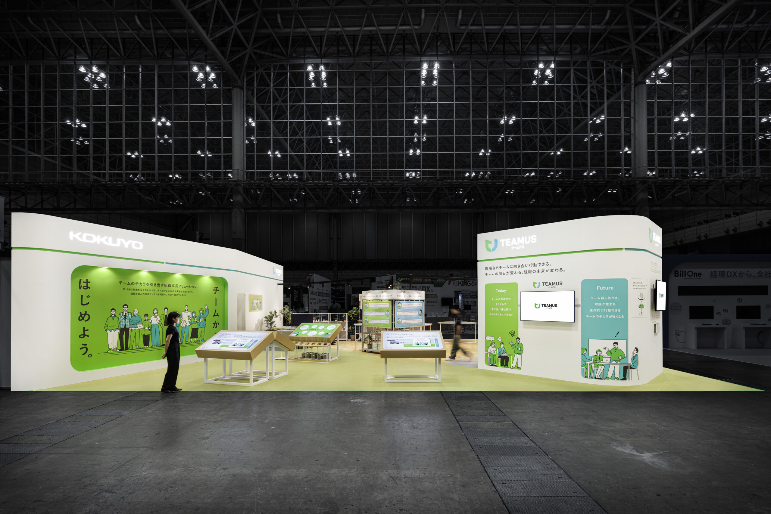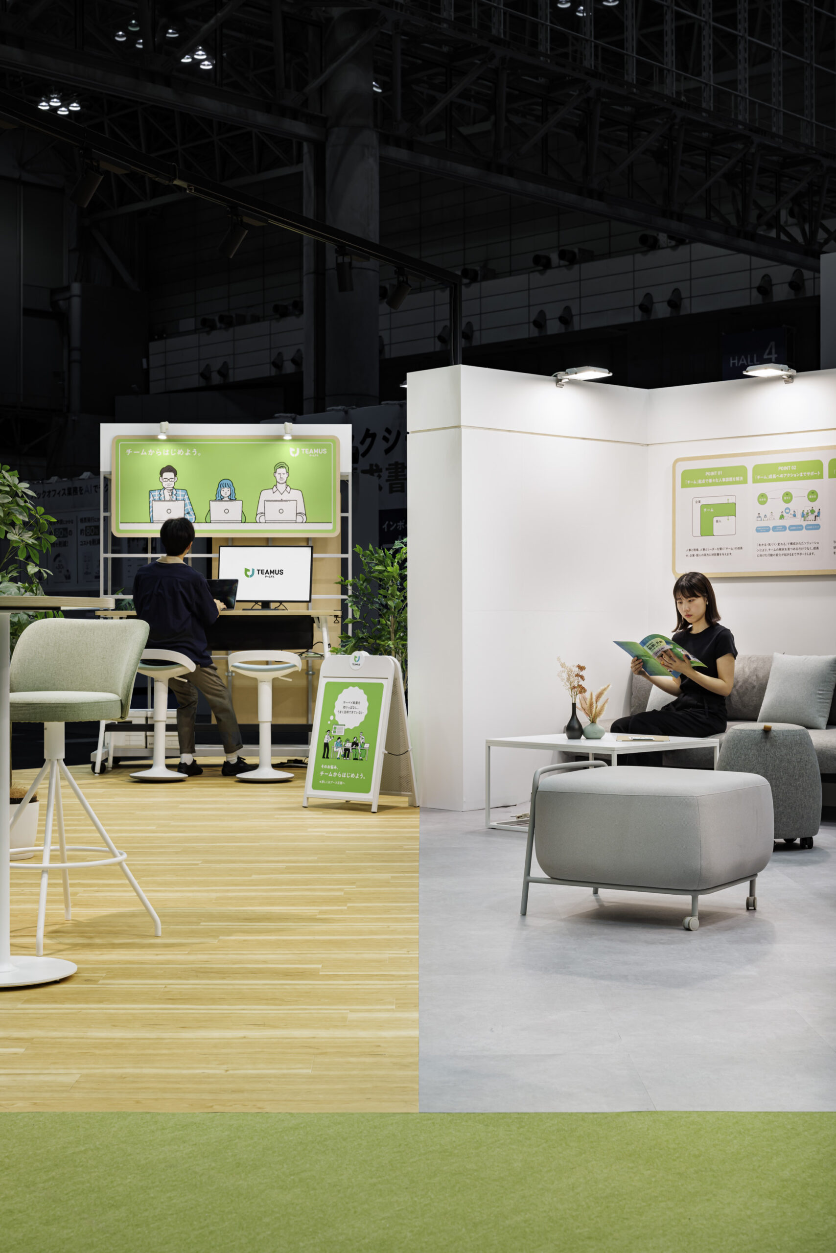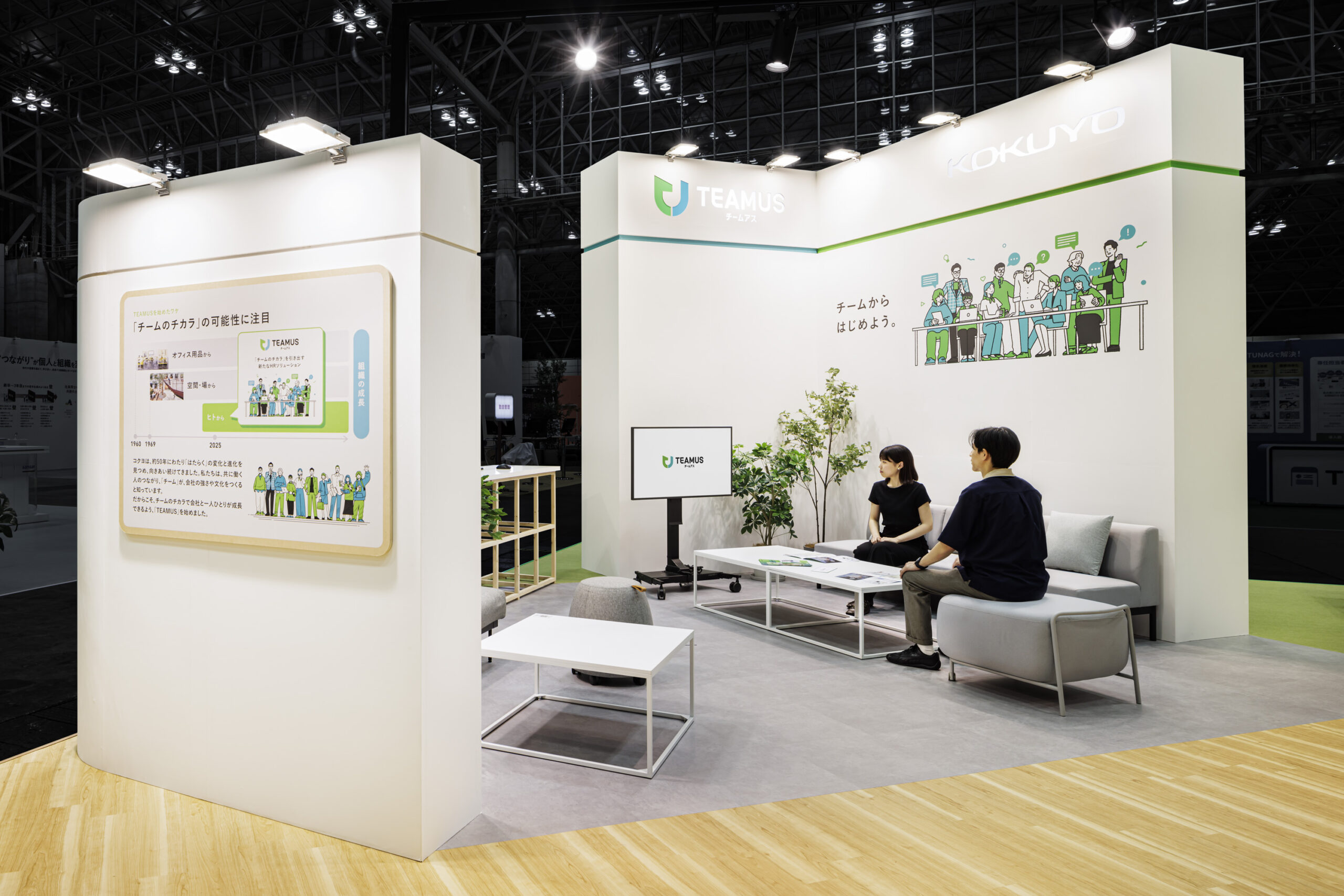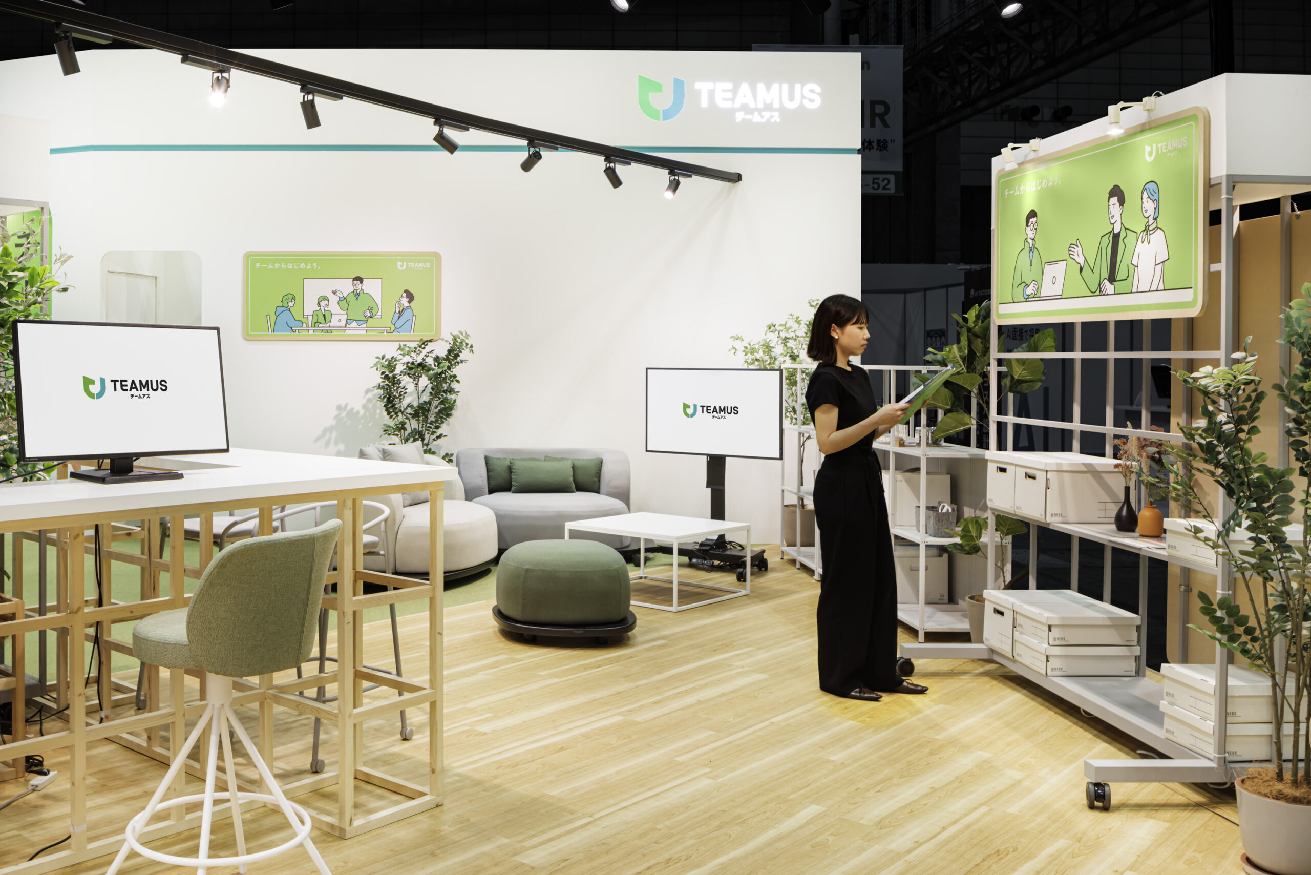 春開催での反響を踏まえ、秋のEXPOでは展示規模を拡大し、TEAMUSの価値や特徴をより立体的に体験できる構成へと発展させました。基本となる「チーム起点」の思想や居心地の良さは継承しつつ、レイアウトに余白と奥行きを持たせることで、複数の対話が同時に生まれる空間へと再構成。 |
