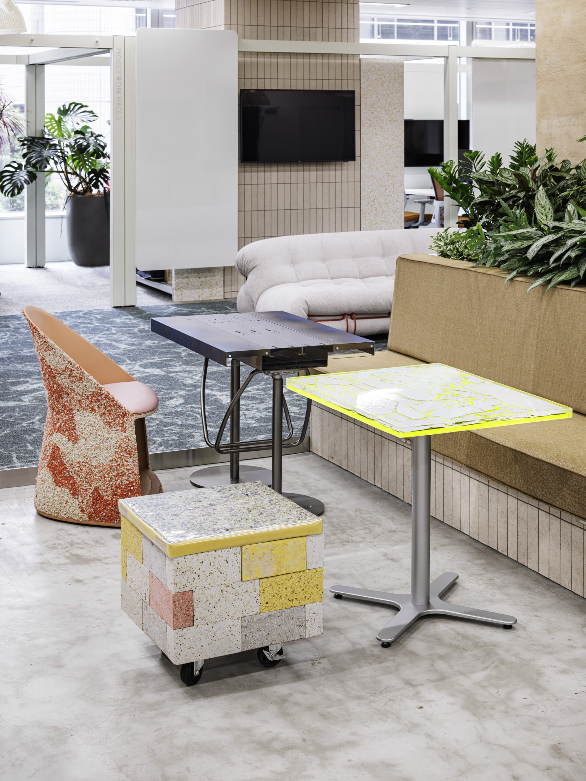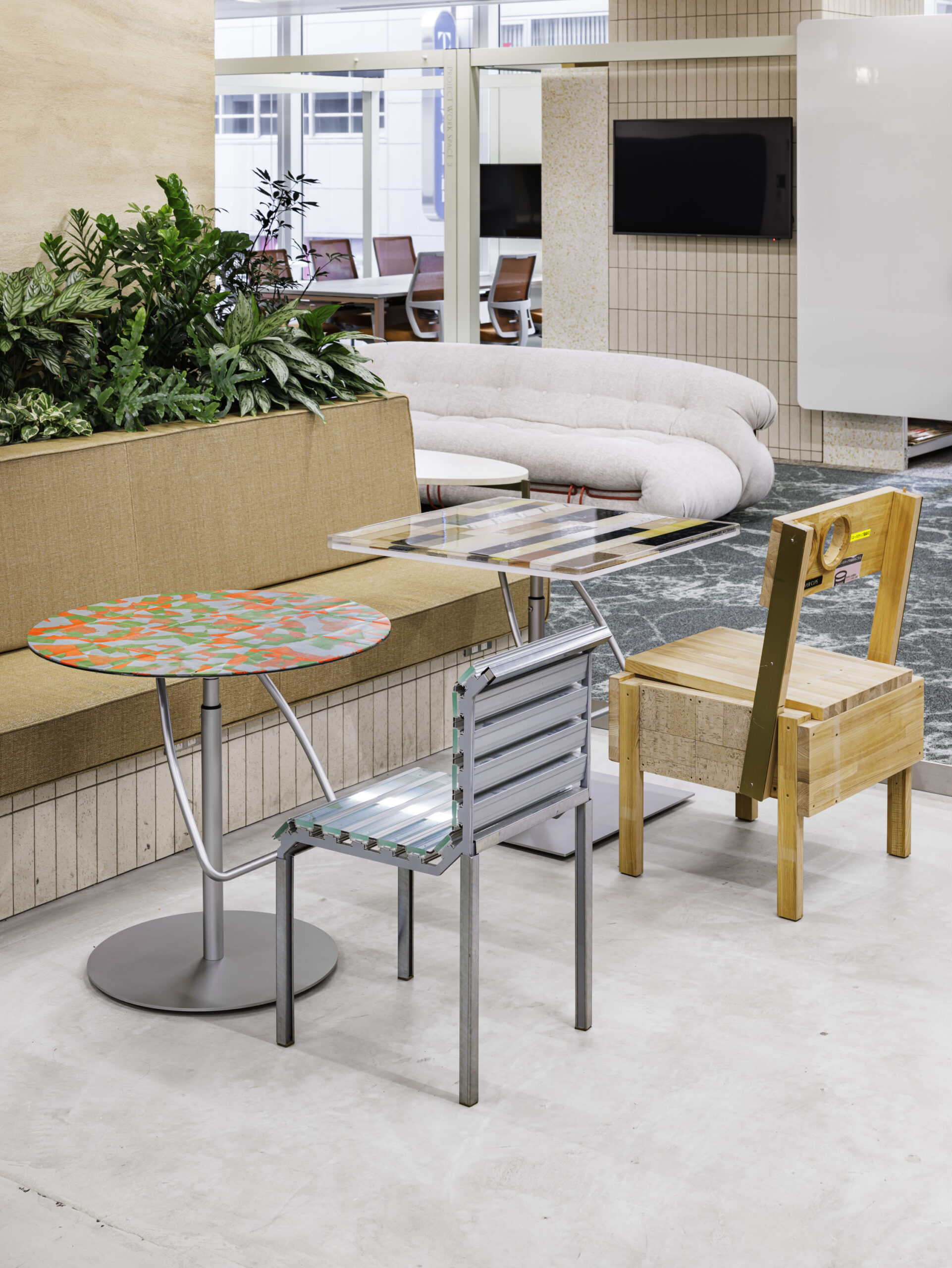 2025年9月にリニューアルされた三井デザインテック株式会社の本社オフィス「CROSSOVER Lab」において、社内の情報やアイデアを共有・発信する場として再構築されたライブオフィス「ANTENNA」内の家具制作をサポートしました。 改装時に発生する資源の探索から、それらをどのような技術やストーリーと掛け合わせて素材・部材化できるかを検討するワークショップを通して導かれたサーキュラーデザインの価値を具現化する制作を担当しました。 など、イス4脚・テーブル4台・カウンター天板・壁面装飾、計10種のプロダクトを制作。 |