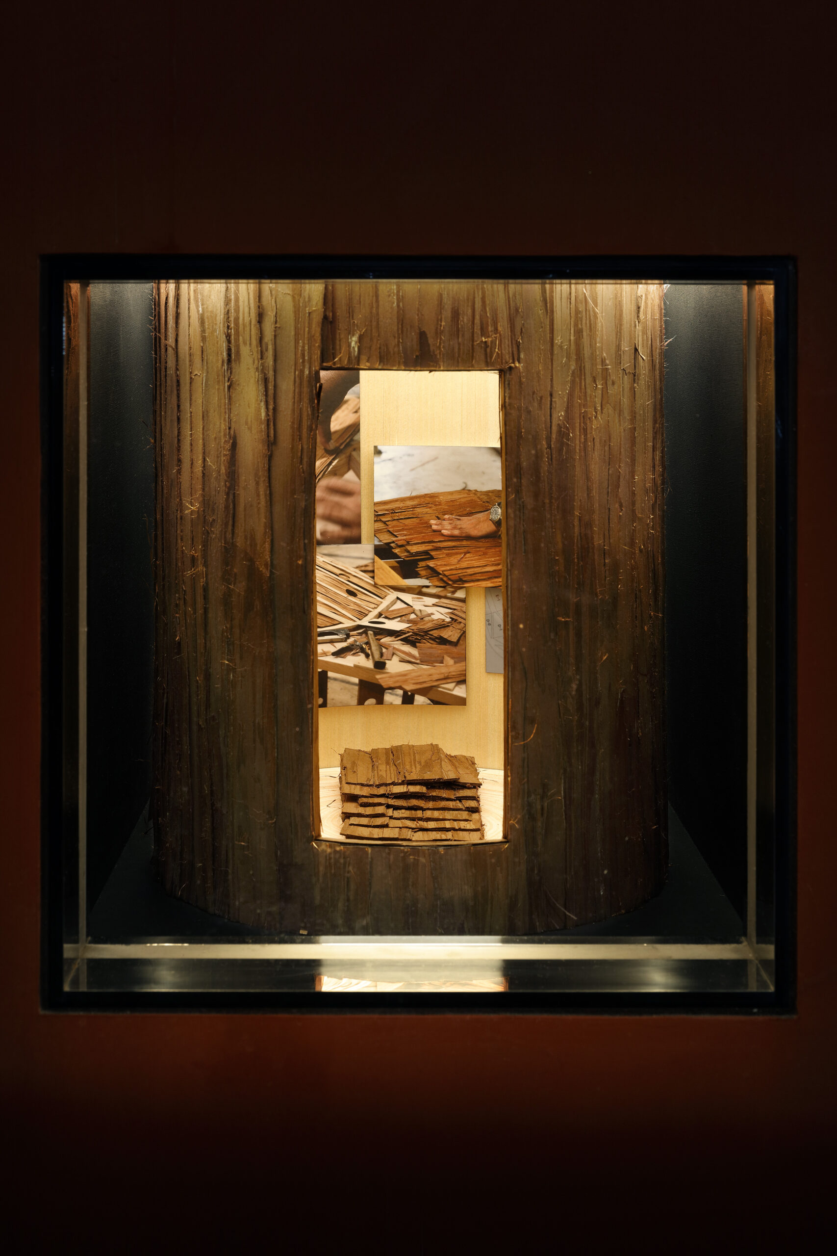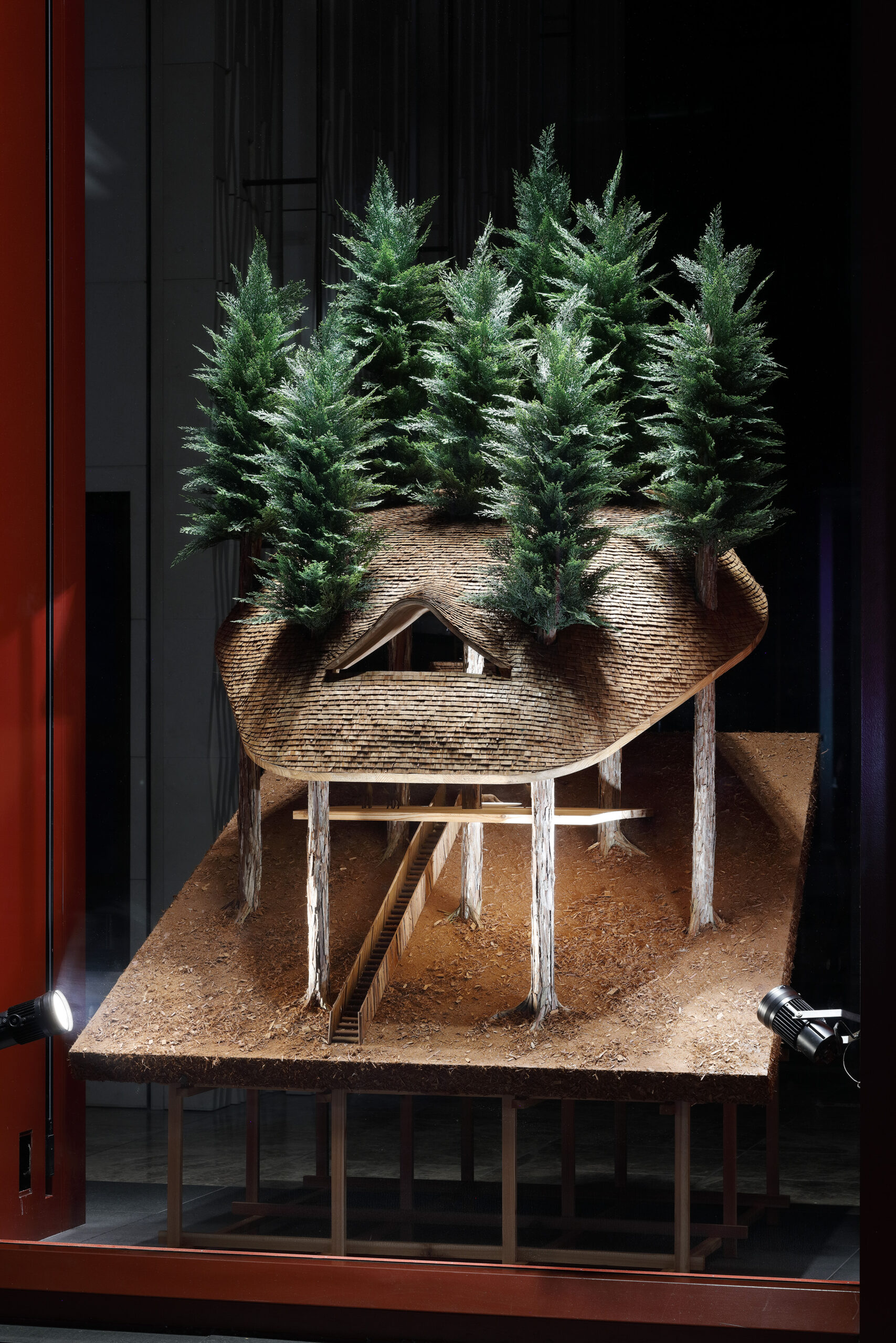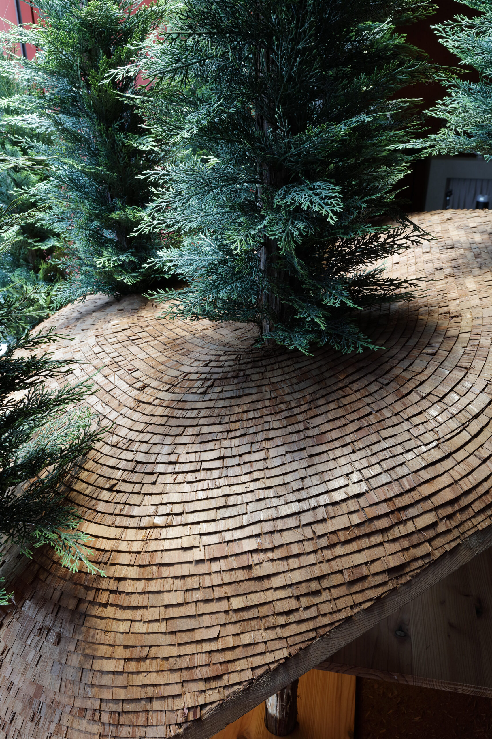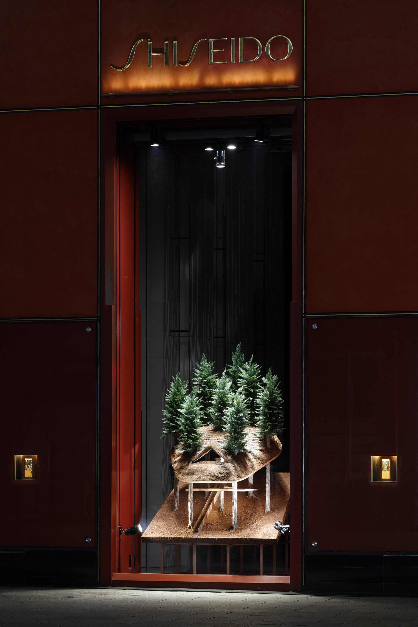 今回の企画は、アートディレクター兼デザイナーの資生堂クリエティブの小林恵理子氏が、「創業以来、万物資生という思想をかかげ、万物と共に私たち資生堂があるということに、あらためて想いを巡らせ未来へのヒントをみつめたい。Personal Forestとはリサーチの中でみつけた“人が1日に必要な酸素量=約8本の木が作る酸素量”という文脈から独自で考えた、人と森の関係性の単位です。檜皮葺を使って人と自然が共存する架空のサスティナブルな空間を作りたい。」という思いが発端でした。 2025年9月から11月にかけて、東京銀座資生堂ビルにて展示された「檜皮葺(ひわだぶき)」をモチーフにしたウィンドウディスプレイ「Personal Forest」。博展は、資生堂クリエイティブの小林氏と共に、デザイン・制作・施工を担当しました。日本の伝統技術と現代のデザインが融合した、新しい表現の可能性を感じさせるウィンドウアート。檜皮葺職人の株式会社友井社寺 友井辰哉さんと共に制作をし、これまでにないショーウィンドウ作品を作り上げました。 |
