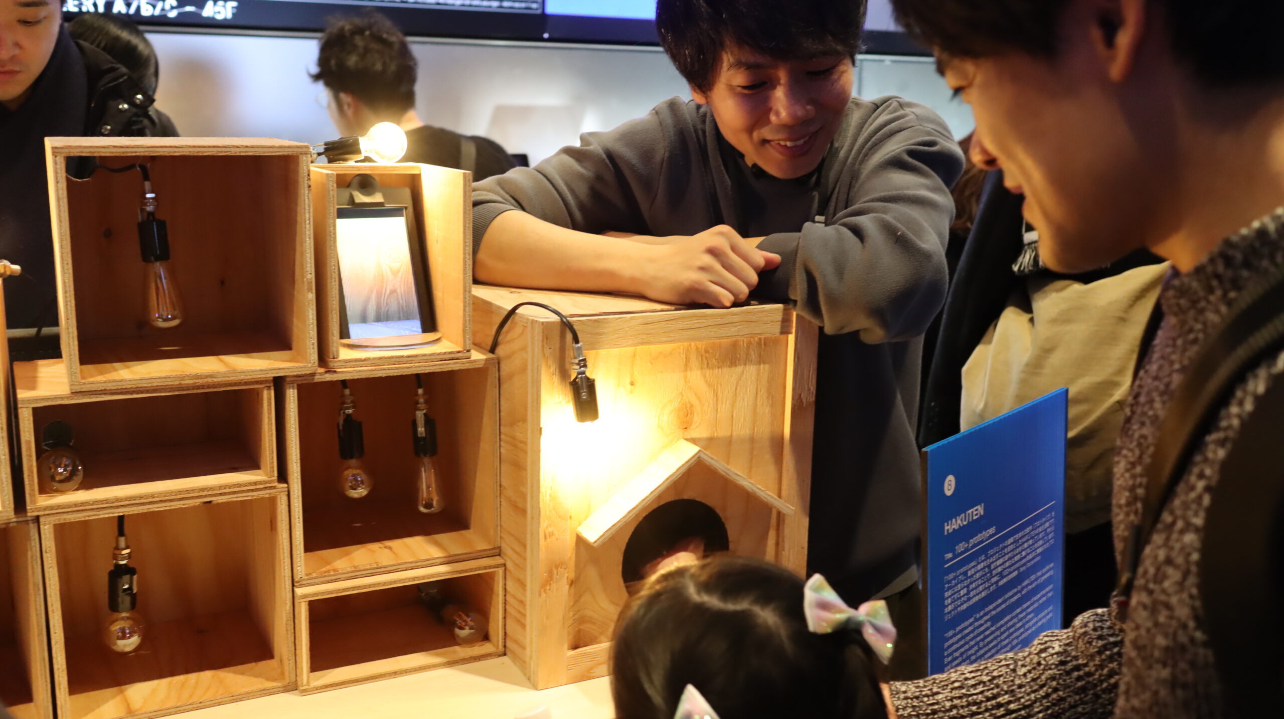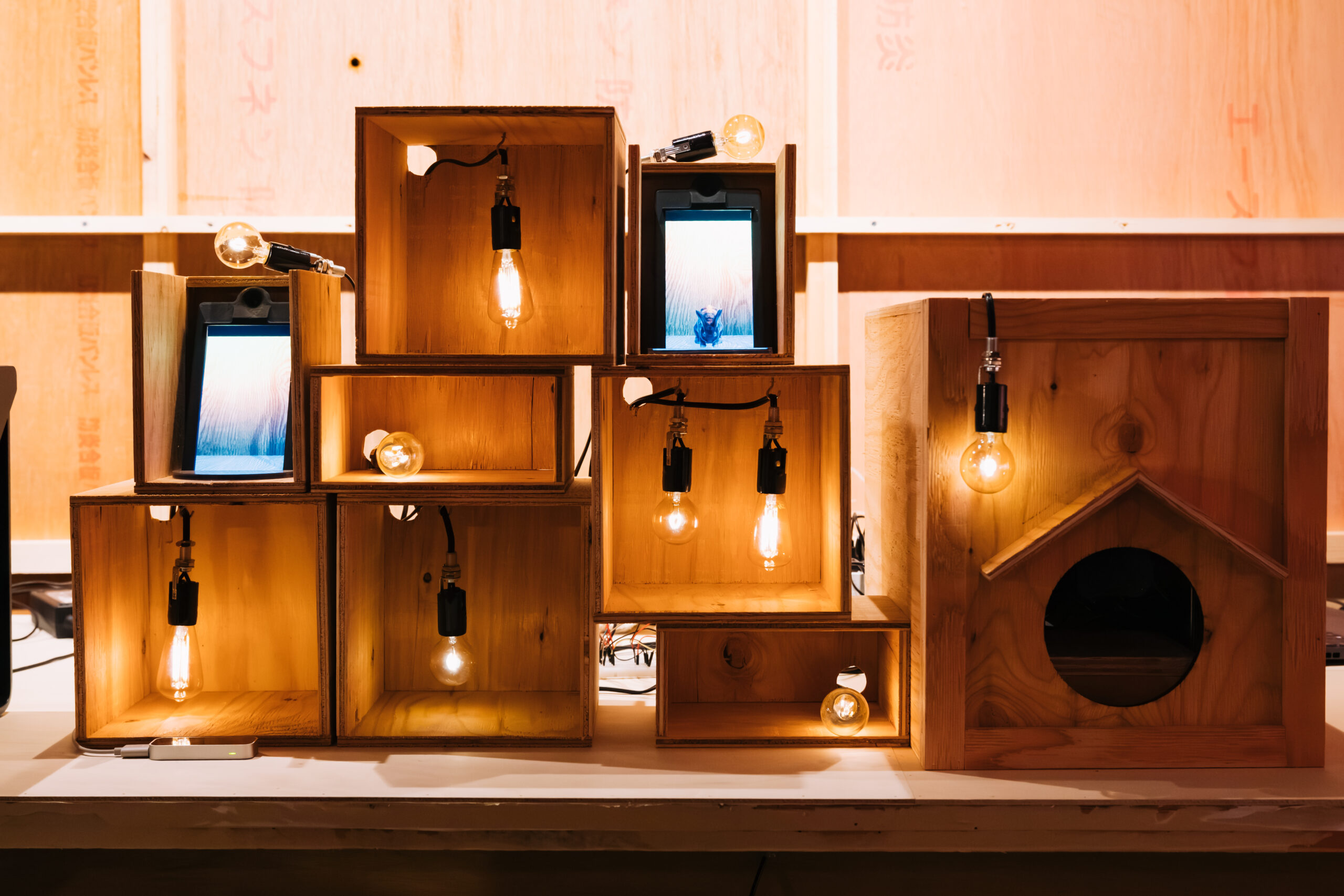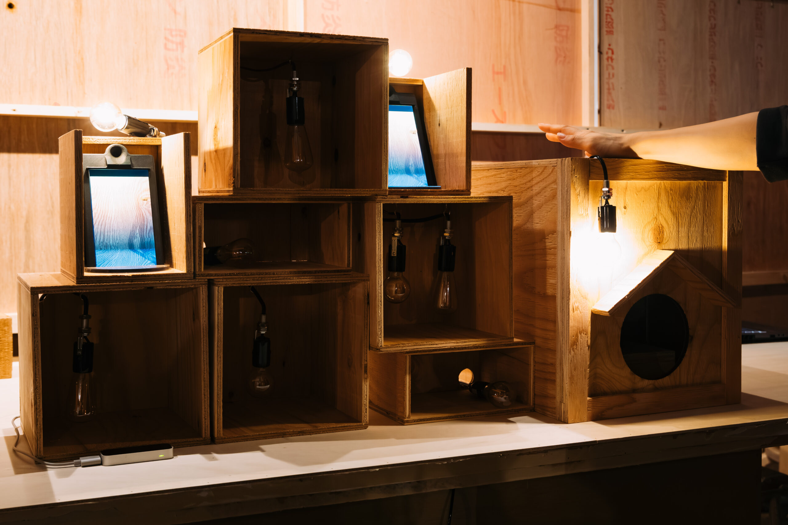 「ウサギの住み家」 博展とソニーの共創プロジェクトとして、空間再現技術で体験デザインの未来を模索するために制作した、プロトタイプ作品です。 モニターの存在感を消し込む設えと段階的に親密度が増すインタラクションを設計。箱を叩くと振り向く、体験者の動きを真似する、餌やり箱に手を入れると本当にそこに存在するかのような触覚体験、箱の裏側を覗き込むなど、行為を通じて没入を深める構成としました。 |